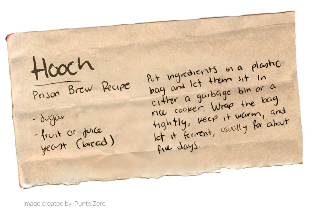 It takes me three days to finally collect everything that I need. Each day I store an orange and a cup of juice in my house. I’ve seen it made in rice cookers, but I know my cellie got caught that way before I arrived. The guard spotted fruit flies in his house and became suspicious. He spent five days in the hole. I am not about to risk getting caught over those pesky flies. Just last week on the first tier, Sanders was caught with 25L. During a cell frisk, the guards found his hooch in a garbage bag, about 4L with pineapple pieces. Then their suspicions grew when they started to question him and he flinched and started to sweat. His house was pulled apart and another 21L was taken from inside his mattress. Without being bunked, Sanders had more to work with, an extra mattress to hide his batch in and keep it warm while it fermented. With New Year’s Eve around the corner, this was a buzzkill for the entire living unit. But I’m not looking to share more than what I need to or make a buck. I use what they already gave me: a plastic bag in a garbage bin. The bag is big enough for a solid batch to share with a lookout and the bin keeps the liquid together like a cooking pot.